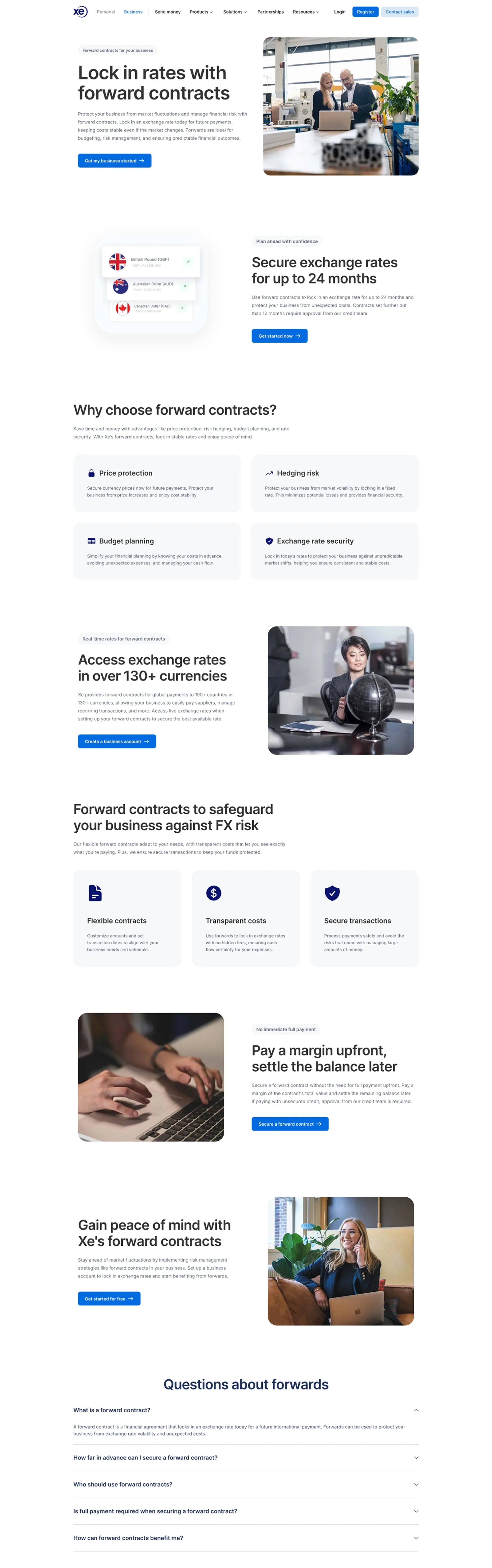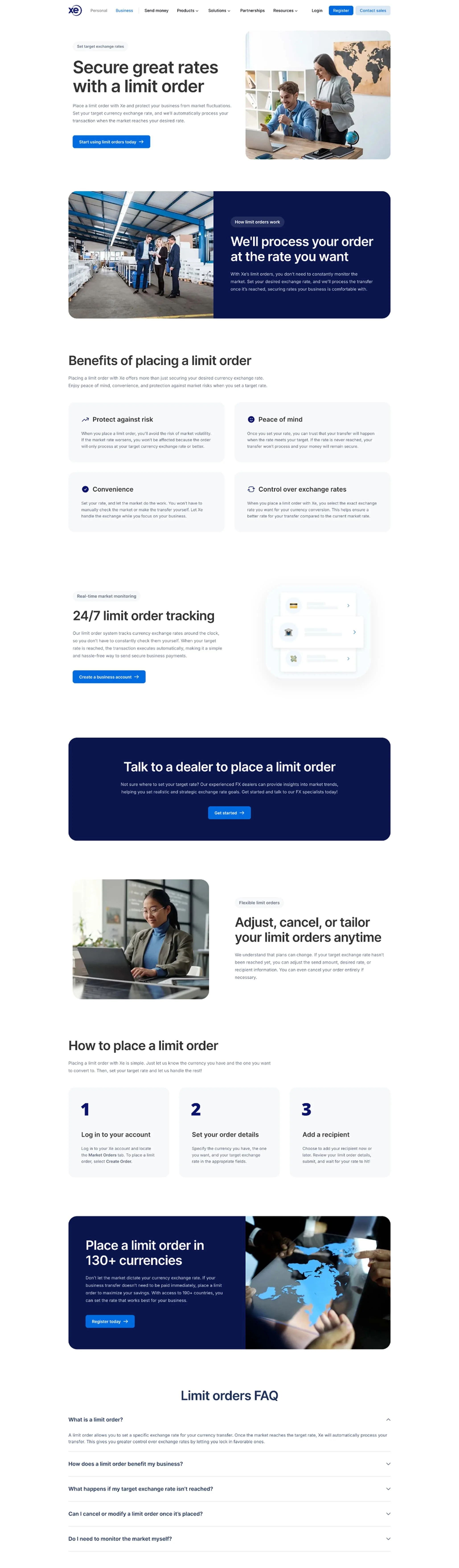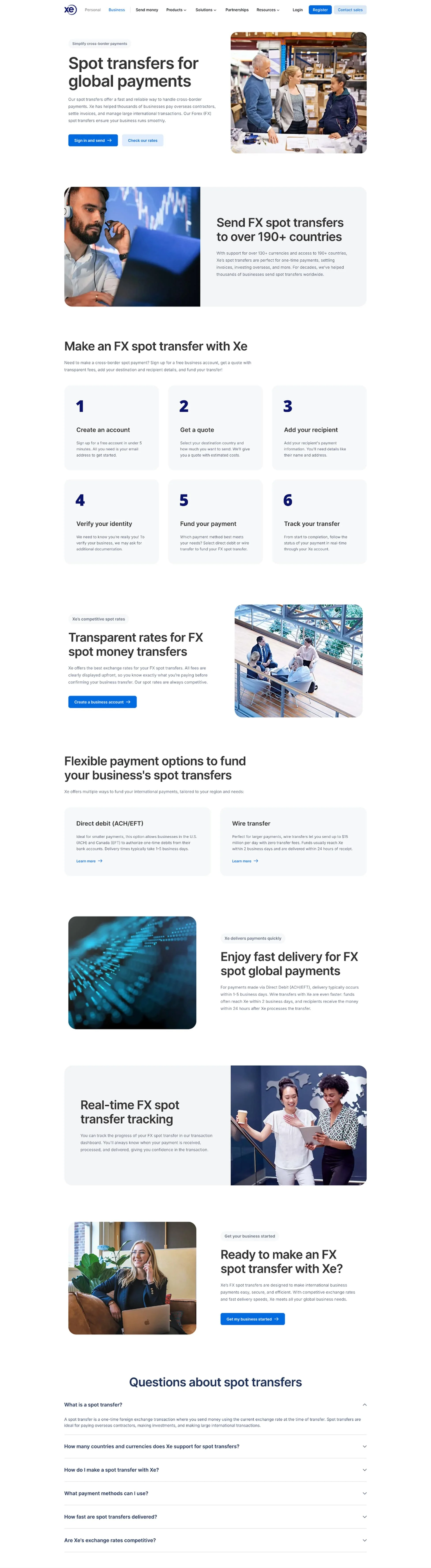 I created individual pages for Xe’s current risk management tools: spot transfers, forward contracts, and limit orders. This gives users more detailed information than what was on the main landing page. Instead of clicking a CTA button that leads straight to the sign-up page, users can now explore how each tool works and decide what’s right for their business before getting started. Each page explains what the tool is, how it works, and how it can help a business make smarter currency decisions.